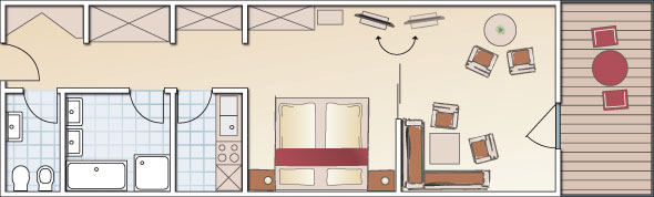 Suite-Süd mit ca. 48 m², großes Panoramafenster, Schlaf- und Wohnraum teilbar, Safe, 2 Sat-TV, Radio, Telefon, kostenlosem WLAN, Balkon, Badezimmer mit Dusche, Badewanne, Doppelwaschtisch und Bademantel, weiterer Raum mit WC und Bidet, Bettengröße 2,10x2m.