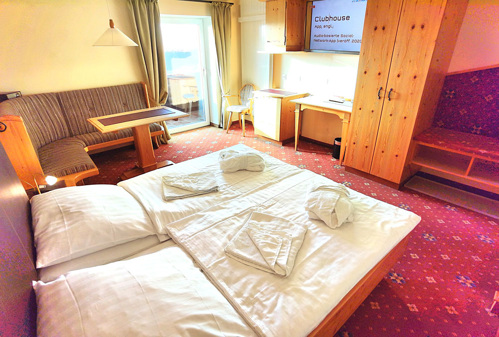 Doppelzimmer-Süd mit ca. 24 m², Dusche, WC, Balkon, Sat-TV, Safe, Telefon, 1 Treppe, Bademantel und kostenlosem WLAN, Bettengröße 1,80x2m. Bei Buchung eines Doppelzimmers zur Einzelnutzung berechnen wir einen Aufschlag von 20 % auf den Tagespreis.