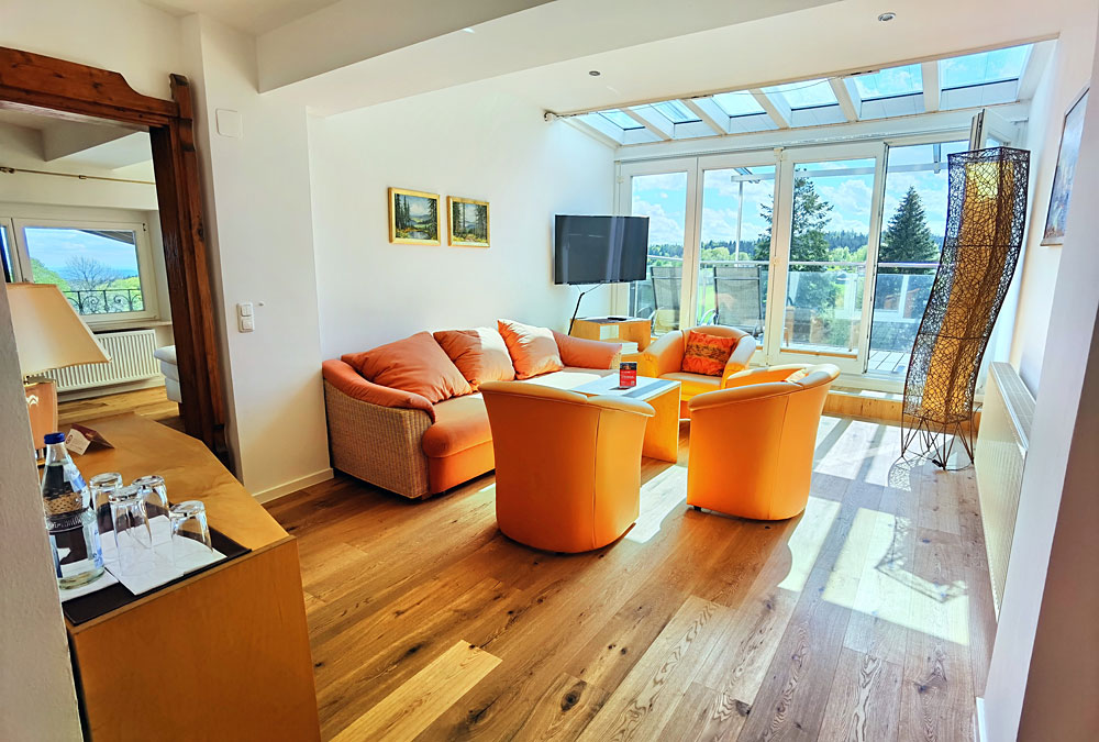 Suite-West mit ca. 48 m², Wintergarten-Loggia, Sat-TV in Schlaf- und Wohnraum, Safe, Telefon, Bad mit Dusche und Badewanne, WC getrennt, Doppelwaschtisch, Bademantel und kostenlosem WLAN, Bettengröße 2x2m.